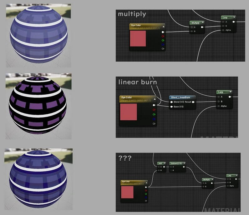 An alternative that's closer to what you'd expect linear burn to do in Photoshop: add the two and subtract by 0.5 (as opposed to 1), and multiply that together to give it back some depth. It's only slightly different from how the vanilla linear burn node works, but the visual difference is quite large.